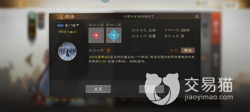 接下来就给各位详细的介绍一下黄月英的战法奇门遁甲在三国志战棋版中有何效果。战法非常强力,这是一个可以主动释放的技能,但是两个回合才能使用一次,大家升级技能的时候需要囤一点将魂,抽卡就有,很简单。铺垫了这么多,可以让一个范围的友军提高攻击力和免伤率,算是一个万金油技能了。