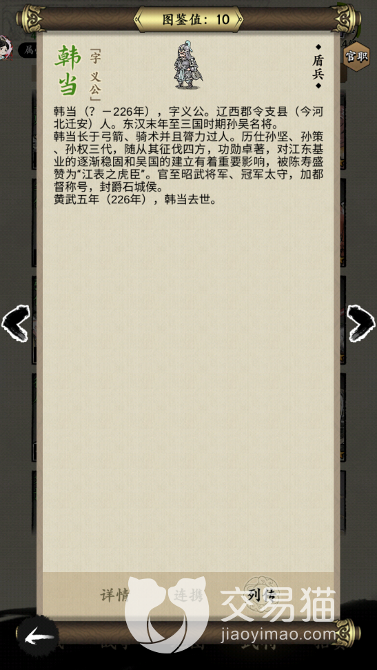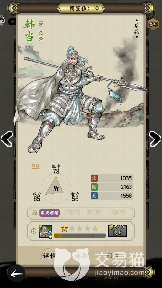 前面给大家介绍了几个紫将中的盾兵,还有部分玩家还想知道更多的盾兵角色,既然如此,小编就将绿将中的盾兵也介绍给大家吧,本期就讲讲名将之弈韩当怎么样,韩当就是良将品质中的一个盾兵,这个角色目前在游戏中是非常好获取的,要是大家前面几章主线没有盾兵可以用,韩当也可以尝试使用哦。
