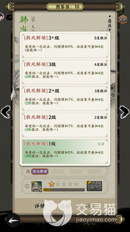 韩当的统率只有78点,他的武力值要比统率高一点,有85点,因为是绿色的奖励,所以韩当只有一个技能,这个技能叫做敢死解烦,在每一次韩当受到攻击的时候就会触发这个效果,对面要是有敌军成功的攻击了韩当,韩当就会增加5%的闪避,这个闪避的效果也是可以叠加起来的,一共可以叠加4次,也就是最多增加20%的闪避。