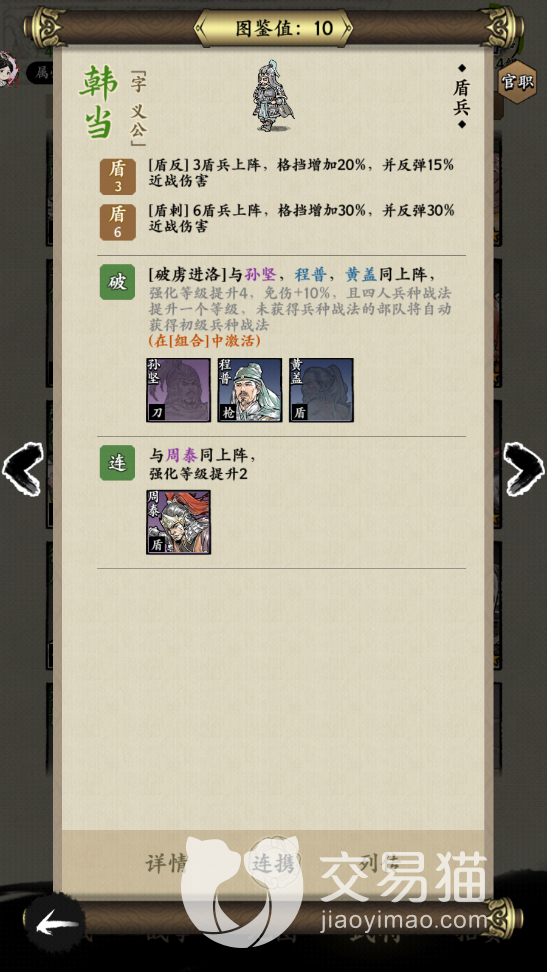 韩当是盾兵,盾兵要是同时三个相同兵种在场就可以触发盾反的效果,这个效果可以增加20%的格挡,并且反弹15%的近战伤害,要是同时6盾兵在场上的话,就可以触发盾刺的效果,格挡增加30%,反弹30%的近战伤害。