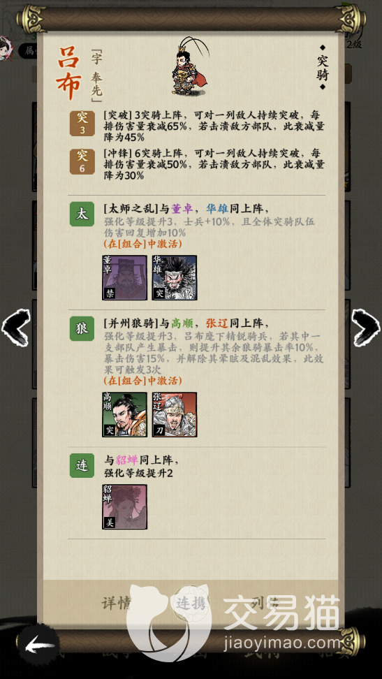 最后一个技能是天下无双,这个技能在使用的时候可以在战斗中,第一次被攻击的时候直接无视,并且可以闪避敌人的暴击。吕布要是组成阵容的话,可以跟董卓以及华雄组成太师之乱这个阵容,阵容可以带来伤害提升的效果,或者是跟高顺张辽一起组成并州狼骑的阵容,效果加成也不错。