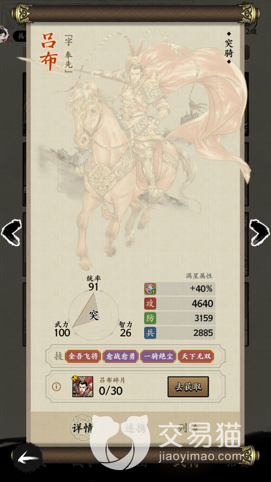 吕布在强度上面自然是按照最强的品质来制作的,大家可以在橙色的武将中看到吕布,他的定位是突骑,武力值已经是100点,相比之下智力只有26点就有点偏科了,统率有91点也比较符合吕布的强度,一技能是金吾飞将,这个技能暴击率会提何时能20% ,在战法攻击伤害减少的时候,还会将敌人认定为被击溃的状态。