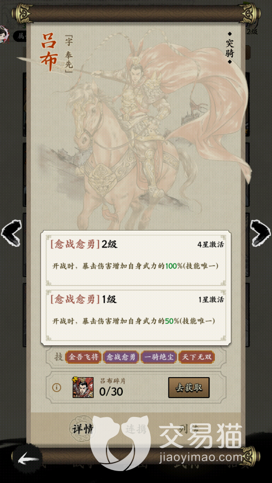 二技能是愈战愈勇,这个技能在开战的时候可以提升自己武力的50%暴击伤害。三技能是一骑绝尘,这个技能可以为吕布带来先手值加一的效果,还可以带来群体增益,己方全体的成员在暴击率上面可以增加15%的数值。