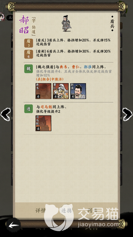 而盾兵的两个兵种战法盾反以及盾刺小编就不多做介绍了,只要大家满足3到6格的盾兵上场就可以触发,要重点讲一下的就是好郝昭可以组建的魏之强者阵容,这个阵容中有典韦、曹仁以及郭淮,组成成功之后强化等级4级,而且反弹的伤害也会增加10%。
