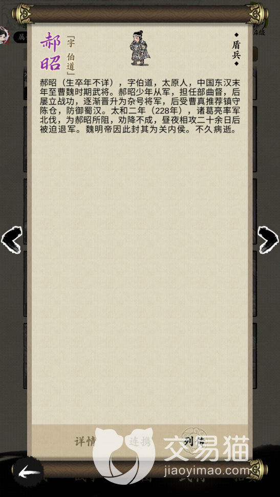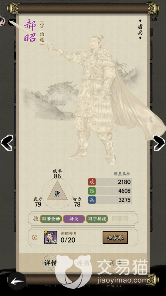 大家想要盾兵介绍的就来看看本期的名将之弈郝昭怎么样的内容,其实在游戏中大家是可以在上面找到很多盾兵的,但是除了绝品的盾兵,只有稀世的盾兵品质比较高,但是绝品的武将不好获取,因此小编给大家介绍一下郝昭这个角色吧,要是大家没有更强度盾兵可以用,就用他吧。