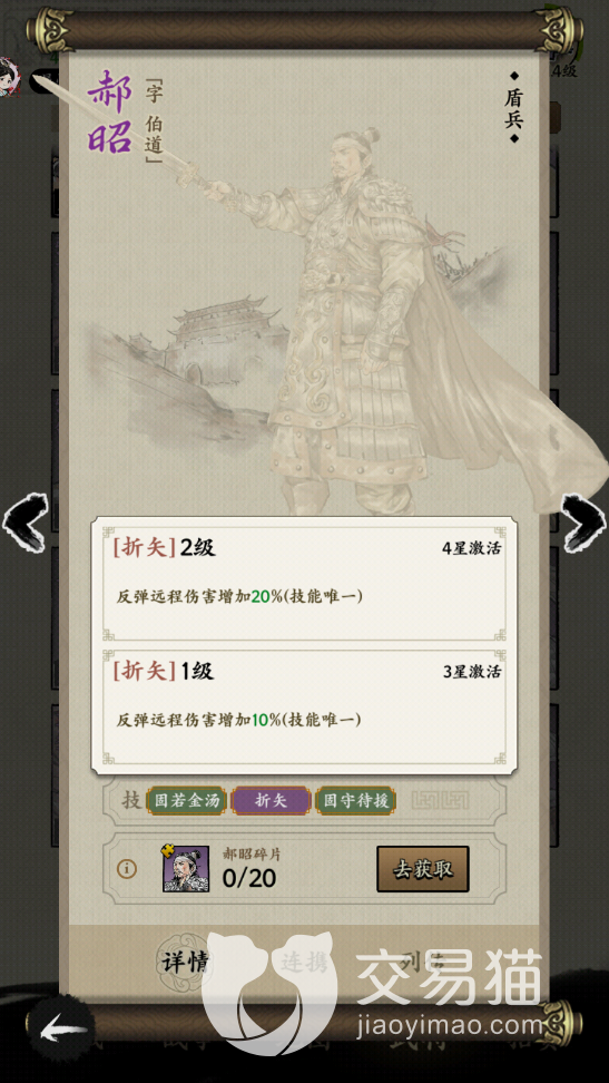 二技能折矢,这个技能是可以增加反弹伤害的,在上面带来的加成是有10%。三技能是固收待援,这个技能也比较简单,在郝昭第二次行动之后,就可以恢复自己30%的兵力,这个效果相当于一个恢复类的技能。