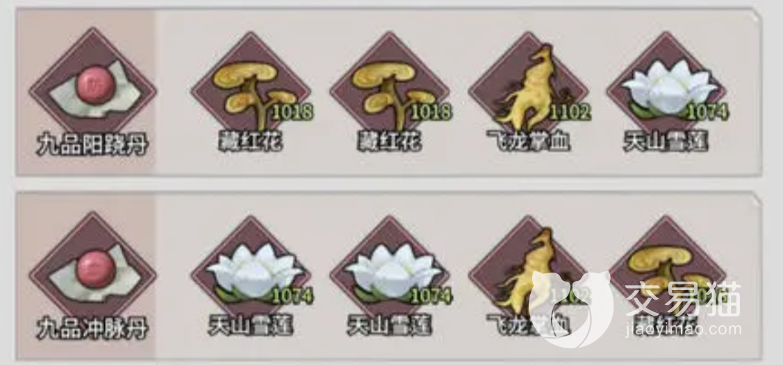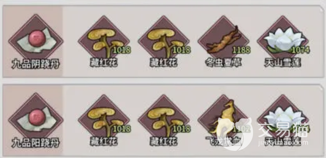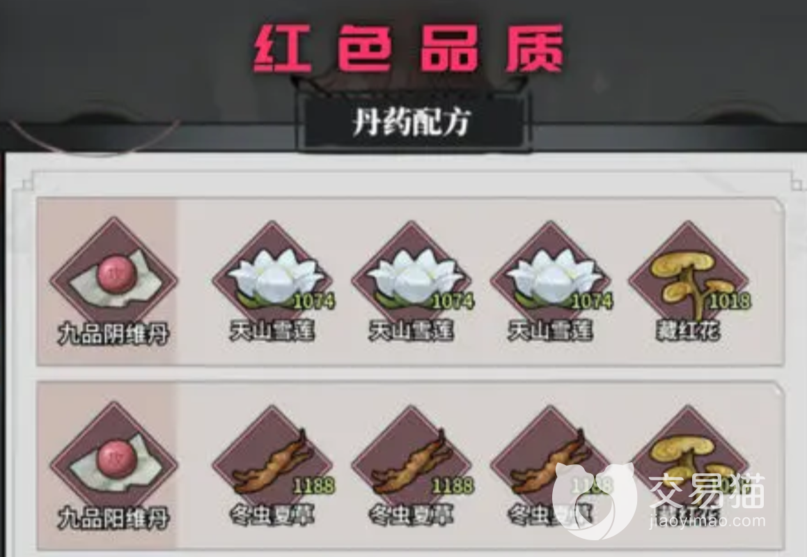 九品属于顶级的丹药梯队了,成型之后是红色品质得当需要的材料都是比较稀有的东西而且数量巨大才能成丹,但是对于玩家的提升也是最大的,比如上图的阴阳维丹,前者需要的是三分雪莲最后搭配上藏红花,后者需要三冬虫夏草搭配藏红花,比较的好记住。