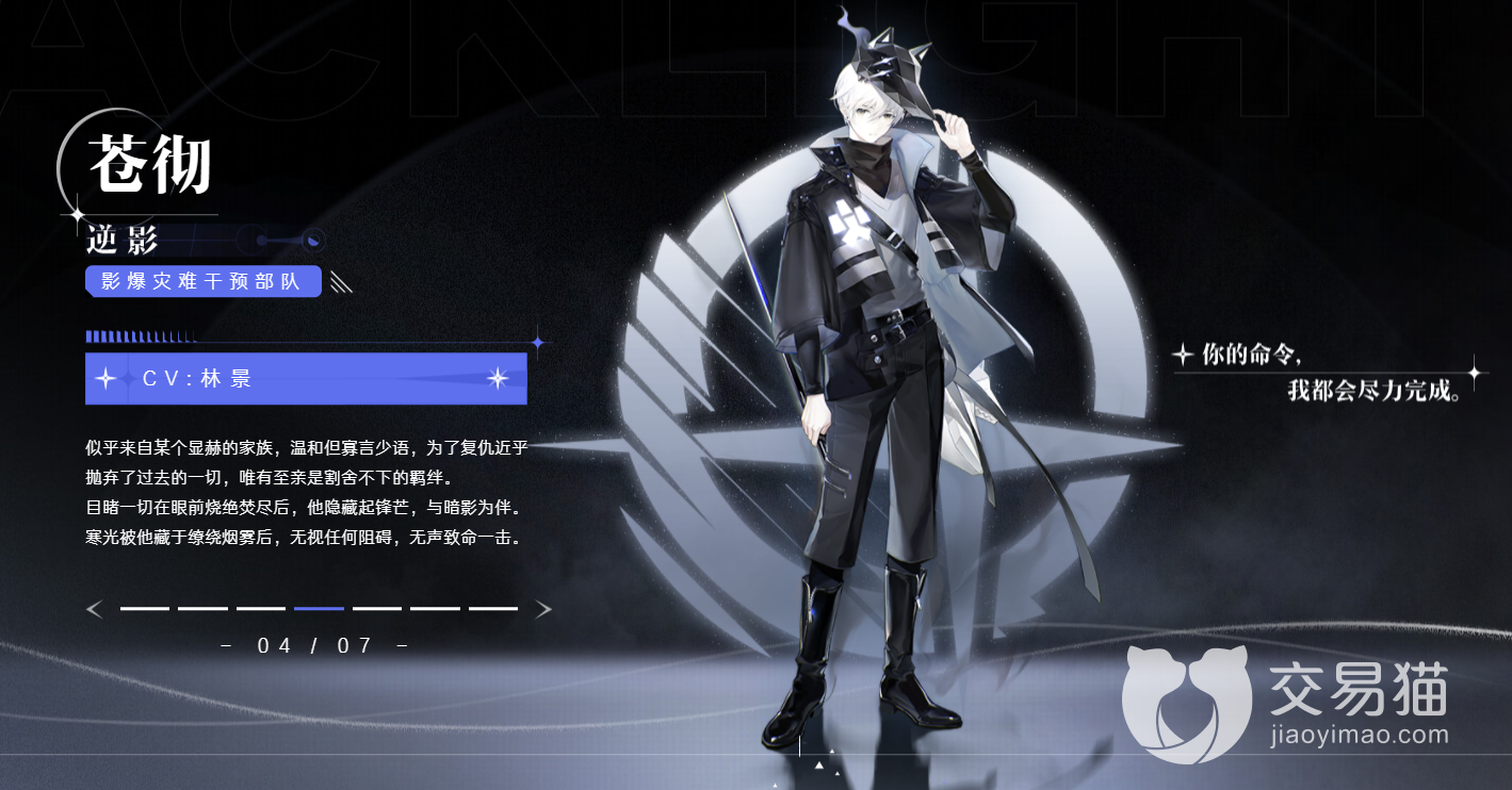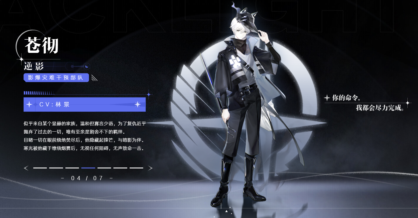 苍彻,是逆光潜入游戏介绍的第一个男性角色。银白色头发的少年形象,从推出以来就有不少玩家直呼奶帅。他和阿莱希娅一样都是作为13小队的队长存在,性格忧郁,但是极度自律。