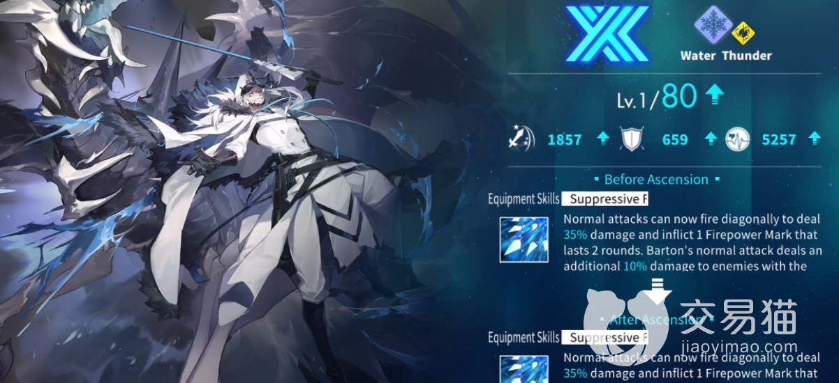 装备技能:火力压制。普通攻击可斜方打敌人,二阶段觉醒之后,加上独特的火力印记,作用生效于普通攻击,对叠上这个印记的敌人伤害额外再加10%。三阶段觉醒之后,所有攻击都能触发印记效果,需要注意的是火力印记只存在于两个回合。