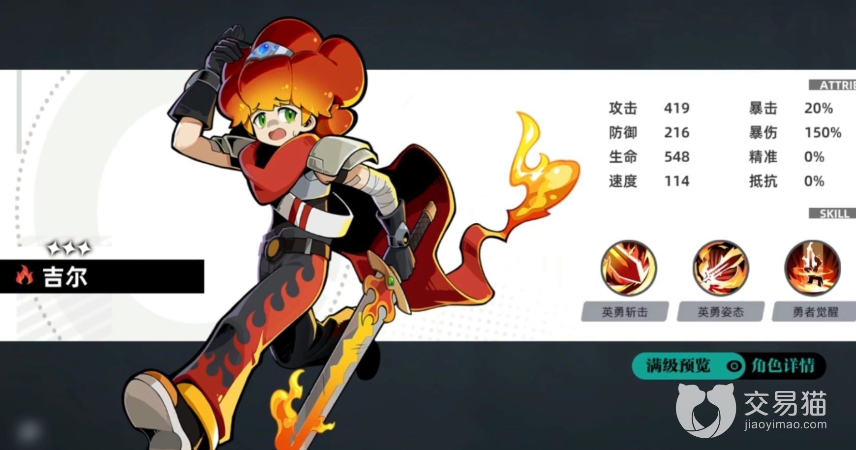 吉尔的技能一是【英勇斩击】,他会手持长剑来向前进行一段砍击,这个攻击能让吉尔有60%概率获得1回合攻击的提升状态;技能二是【英勇姿态】,该技能在释放后,他能拿出一把宝剑来展现自己有些稚嫩的勇者风范,这一技能有机会能够让吉尔获得3回合勇者状态;