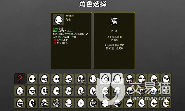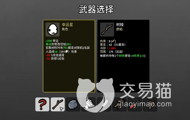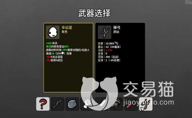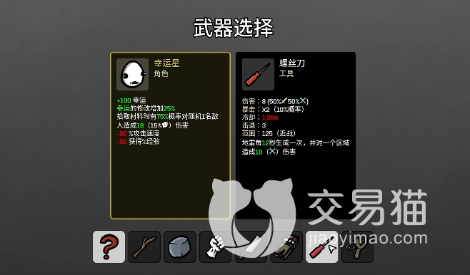 幸运星本身的强点还是在于高幸运能够带来的高品质武器和道具,这些需要在关卡中才能体现,武器本身的选择其实对于它特性的发挥并没有什么联系,不过开局的这几个武器还是会存在一个明显的强弱划分,其中个人比较推荐的是“螺丝刀”,虽然它本身的伤害不是特别突出,但它却可以每十二秒生成一个地雷,这个地雷远程引爆清理怪物会很舒服。