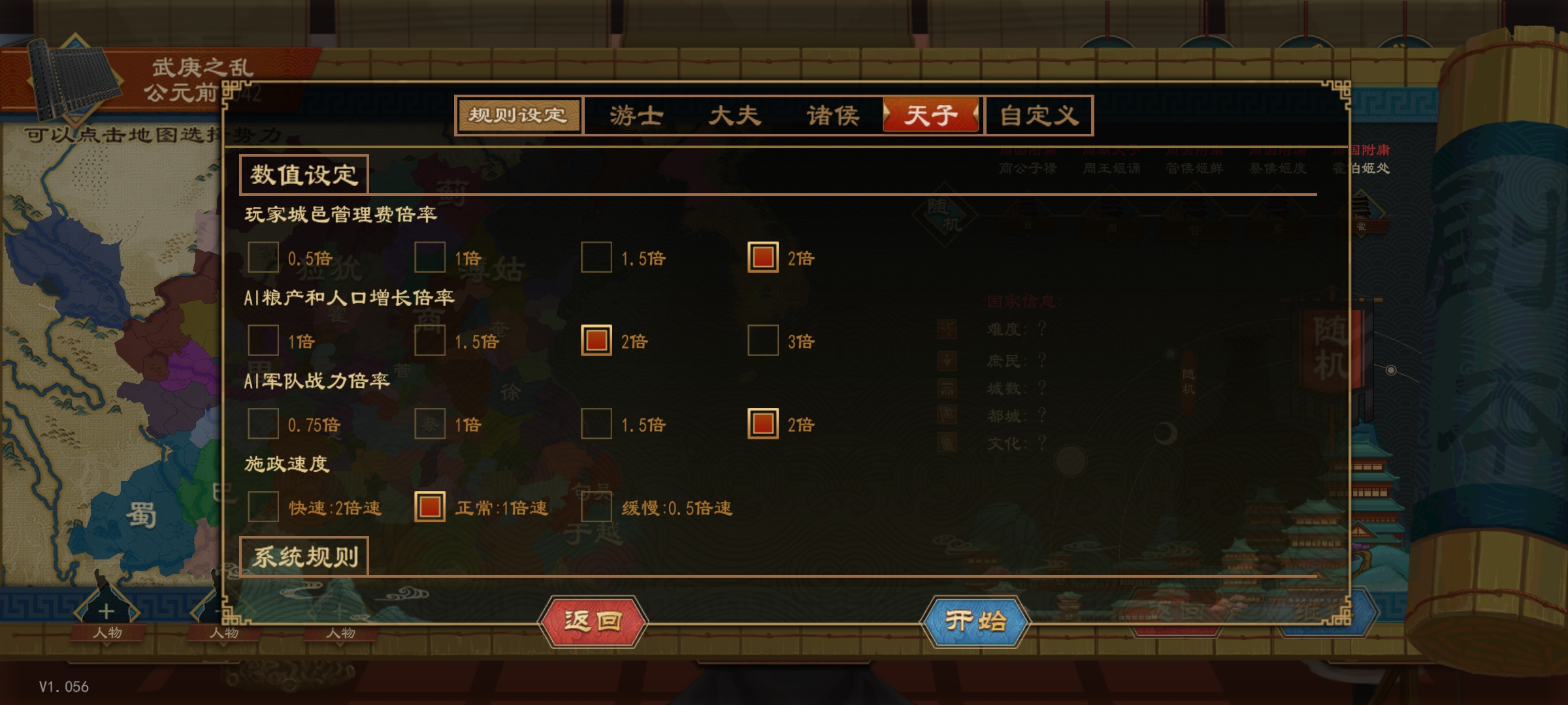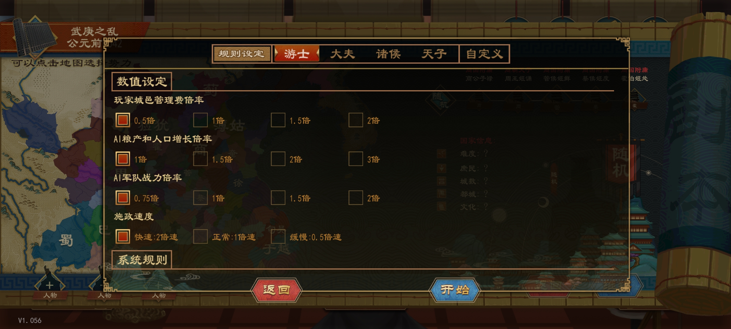 如果上述固定参数无法满足需求,玩家可以选择自定义进行设置,小编建议新手宝宝选择固定参数“游士”,要稍微简单一些,在国家选择方面建议选择周这种大国,开局资源会多一些。参数选择方面小编喜欢将所有费率倍速调到最高,其余设置均选否,这种选择优势局会很好打,劣势局也很快结束。