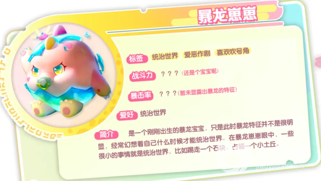 前面既然提到了龙蛋,那么这里自然也是会有对应的角色的,此处将会是刚孵化出来的恐龙宝宝,它的身上还会有残余的蛋壳。原型是一只暴龙,非常的调皮和凶残,最想做的事情便是统治世界了。