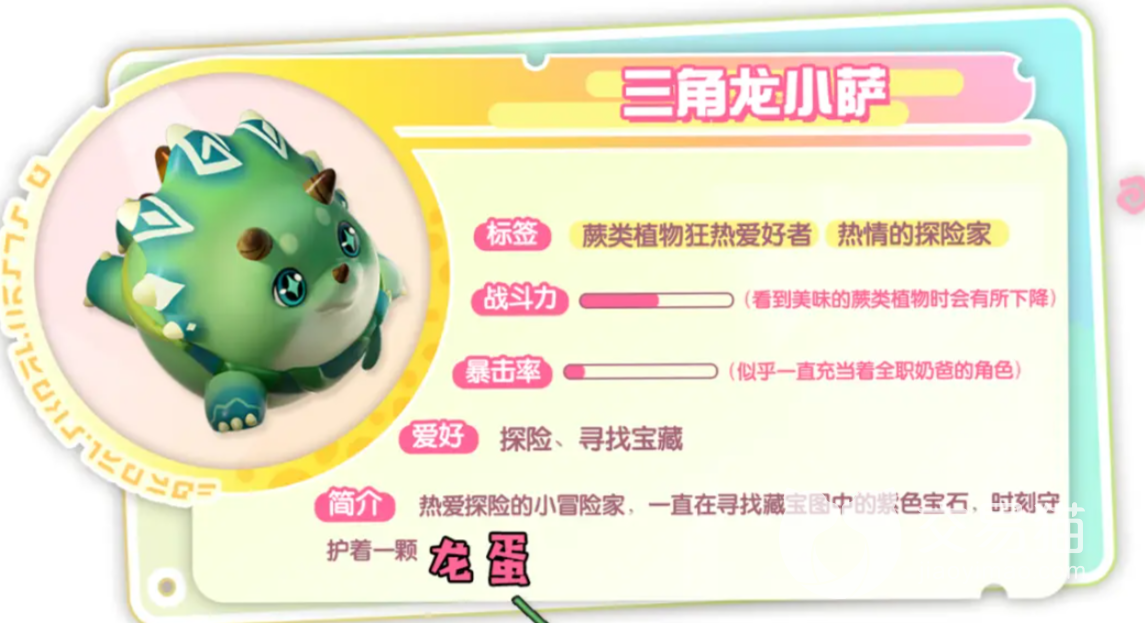 此处已知的装扮有三种,其中一个是绿色的三角龙,它最下湖的就是蕨类植物了,作为一名吃素的龙,他们的对战能力自然是没有那么高的,不过它们很喜欢冒险,在探索的过程中还已知守护着一颗蛋。