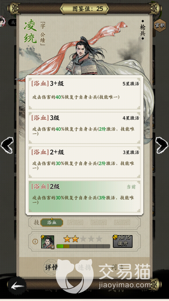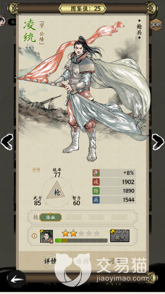 凌统是一个良将品质的武将,在游戏中的定位是枪兵,他的统率是77,武力有85,而智力有60,在上面只有一个技能,浴血这个技能就是他的唯一技能,使用的时候控而已让自己攻击伤害的20%恢复到自身士兵上面,这相当于一个恢复技能。