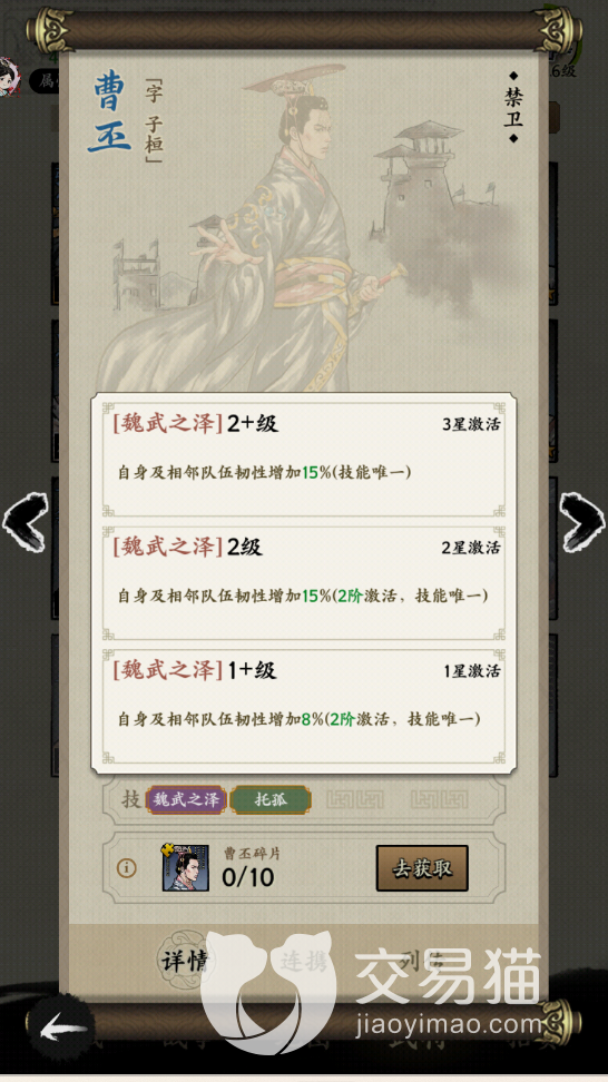 曹丕是一个蓝色的名将,在游戏中的定位是禁卫,统率有77。武力有71,智力上面有83,一技能是魏武之泽,这个技能可以给曹丕自己以及相邻的队伍带来增益,增加的属性是韧性,两支队伍都可以带来8%的韧性增益,在升级之后这个百分比会提升到15%。