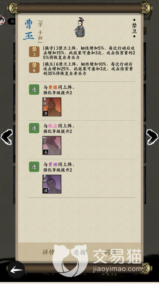 禁卫的两个兵种战法是镇守以及镇压,镇守是三禁卫上场就可以触发的,而镇压是6禁卫上场才可以触发的,可以带来攻击提升的效果,曹仁还可以跟曹操、甄宓、贾诩一起上阵,他们两两上阵就可以触发连携强化效果。