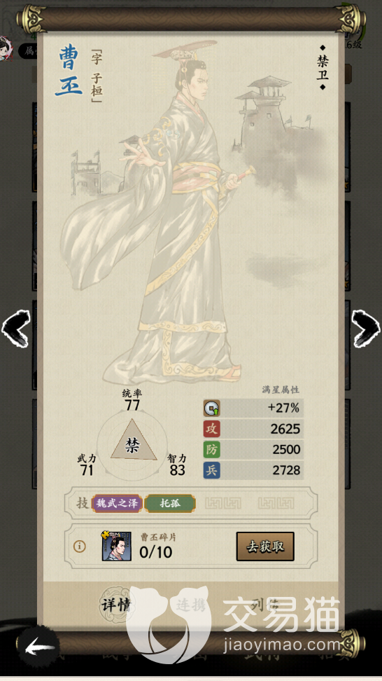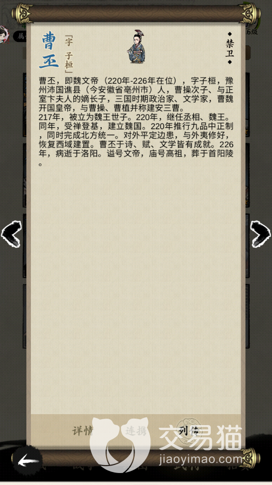 本期给大家介绍一个叫做曹丕的武将,在名将之弈中姓曹的将领还是比较多的,所以很多玩家有可能会搞混,本期先给大家介绍一下名将之弈曹丕怎么样的内容,这个叫做曹丕的武将在游戏中不算一个很强的角色,毕竟品质只有名将,属性就不会高过紫将啦,所以小编是推荐大家前期使用哦。