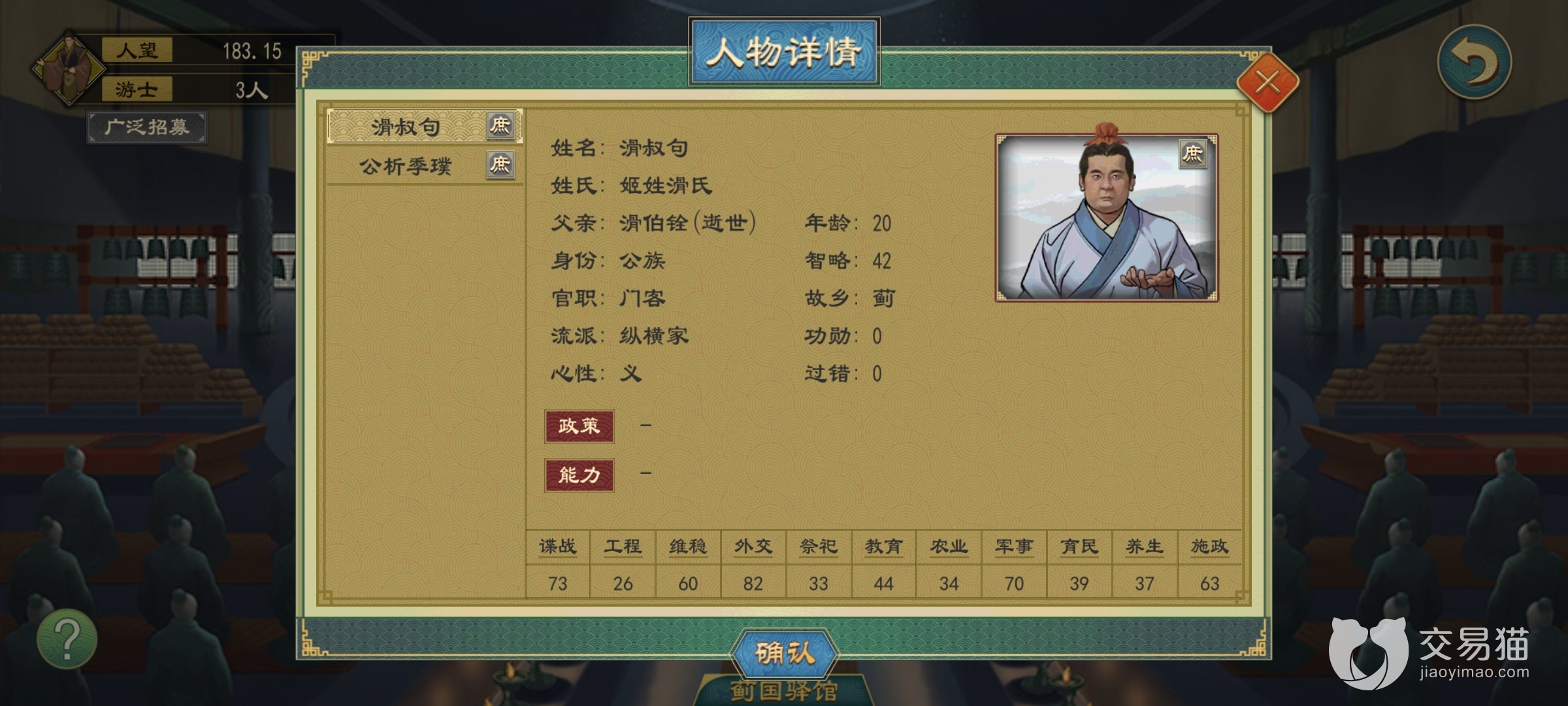 选择一个人物点开可以查看人物详情,总共有11项数值,除此之外还有智略一项,每一项都有对应的作用。比如在学官辩论环节,要选择外交和智略数值高的人物,谍网的组建就要选择谍战数值高的人物。但是教育这个数值就比较特别了,君主的教育数值越高代表这个国家的教育水平越高,进而影响这个国家的新生儿的智略程度。