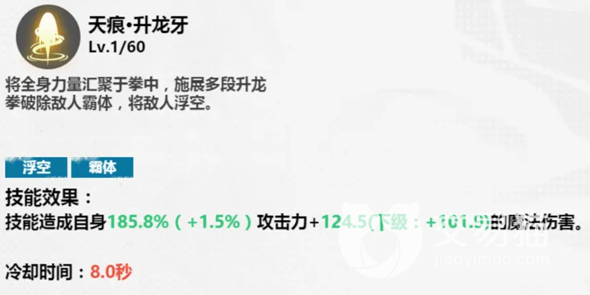 此处有个技能是这会释放出一大片尖刺来对敌人造成持续伤害的,这个就比较适合用来清理那些小怪。而他的天痕升龙牙技能是可以将敌人的霸体形态击破的,这可以说是此角色的核心能力了,还能够产生较高的伤害。