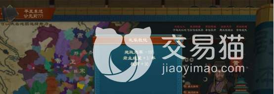 也可以采用置换土地的方式,在侵略别的国家时,和其他国家的土地置换一下,可以让文化协调,也可以利用道具,完成一些相应的任务,就可得到金册宝物,就可以来消灭一些叛乱主义的数值,所以玩家就需要多安排一些宝器道具,给民众们熏陶礼乐教化,提高教育能力,也能让君王的威望升高。