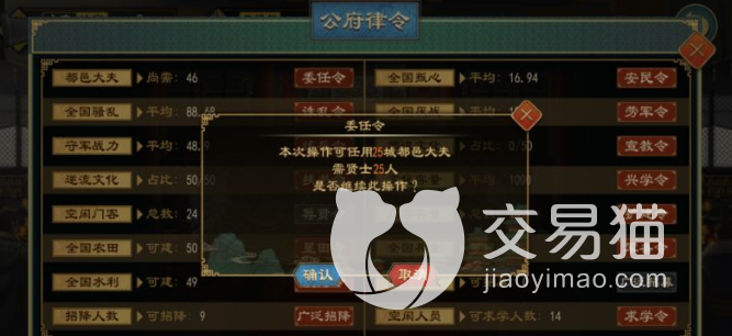 在公府的命令面板上,点击【委任令】,就能在已经建立的城池中,一按就能指定,系统会从官邸中调集人才,前往各个地方担任职务,这个方式还是非常快捷的。