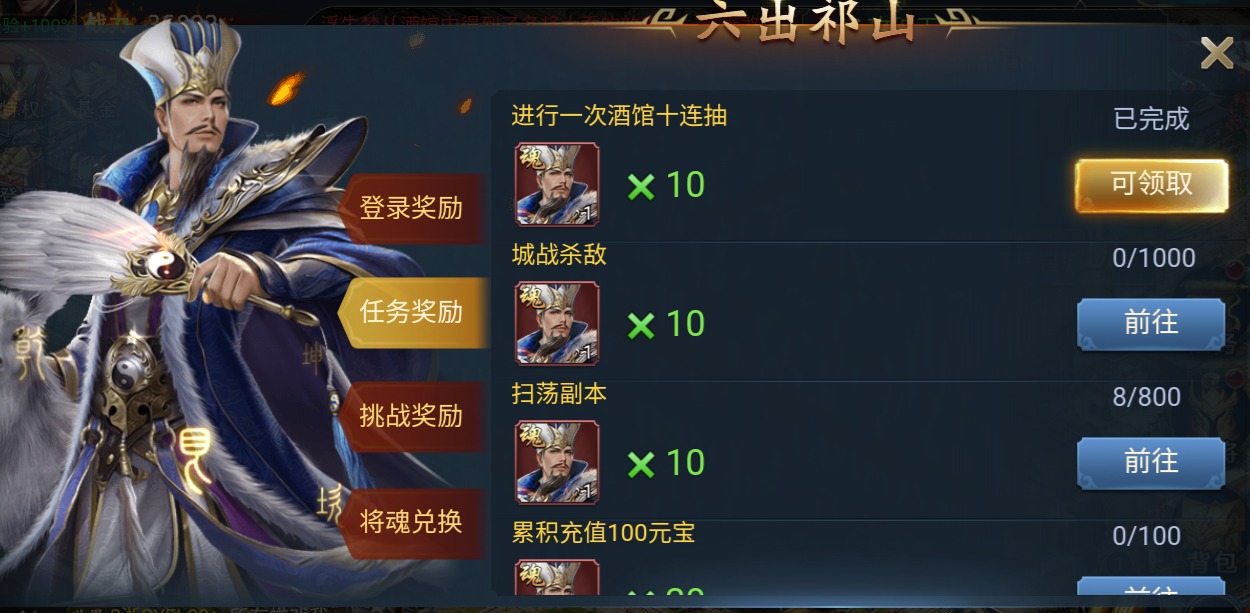 六出祁山:这个属于“蜀传”中的活动,其中包含多种形式的奖励,可通过登录,任务,挑战和兑换这四种方式去获取,里面给的主要是一些蜀国的武将以及培养材料,当然,其中也会含有像铜币和招募令这类的日常资源,利用它们你可以进一步加快自己队伍的成型速度。