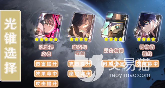 其次推荐玩家选择“晚安与睡颜”这个光锥,光锥的属性是“攻击提升”、“稳定增伤”。该光锥的属性与“以世界之名”比较相似,是其平替的版本,会让对方陷入负面状态,还能增加伤害。