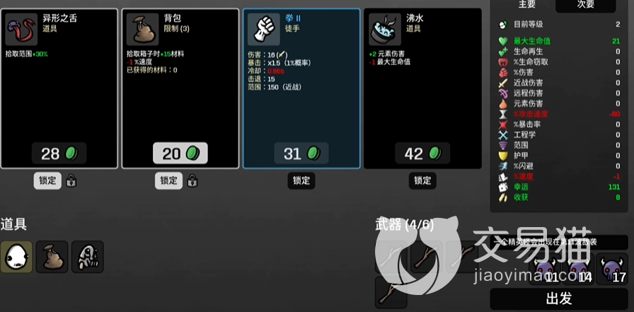 不过需要考虑的是它的攻速和升级速度都变慢了,所以想发育也是比较困难的,前期一定得注意武器和道具的选择,不然很有可能无法顺利渡过关卡,但只要熬过了这些难以过去的时期,后面的发展就都变得顺风顺水了,尤其是商店这里,很早的时候就能够刷出蓝色的武器道具了。