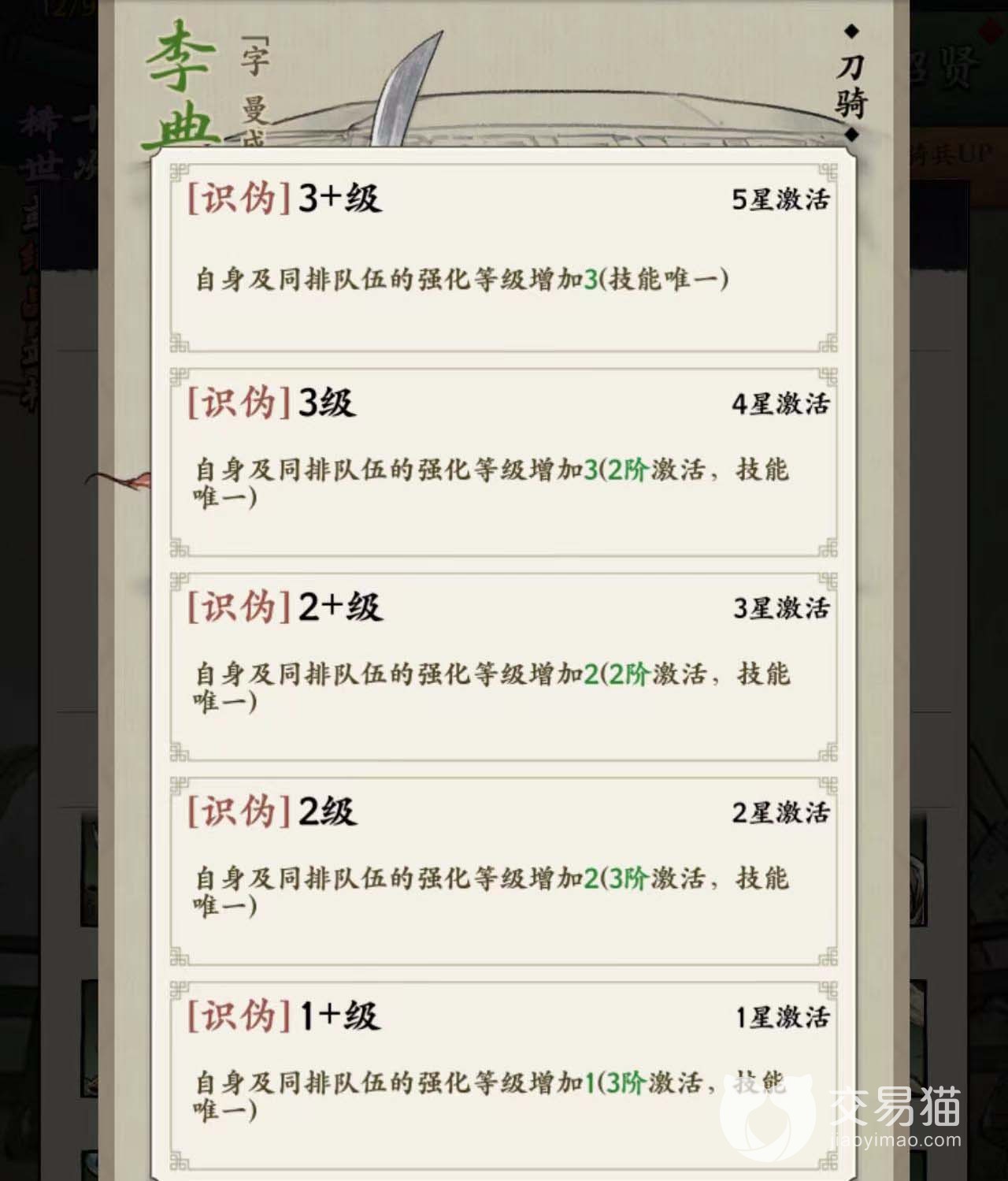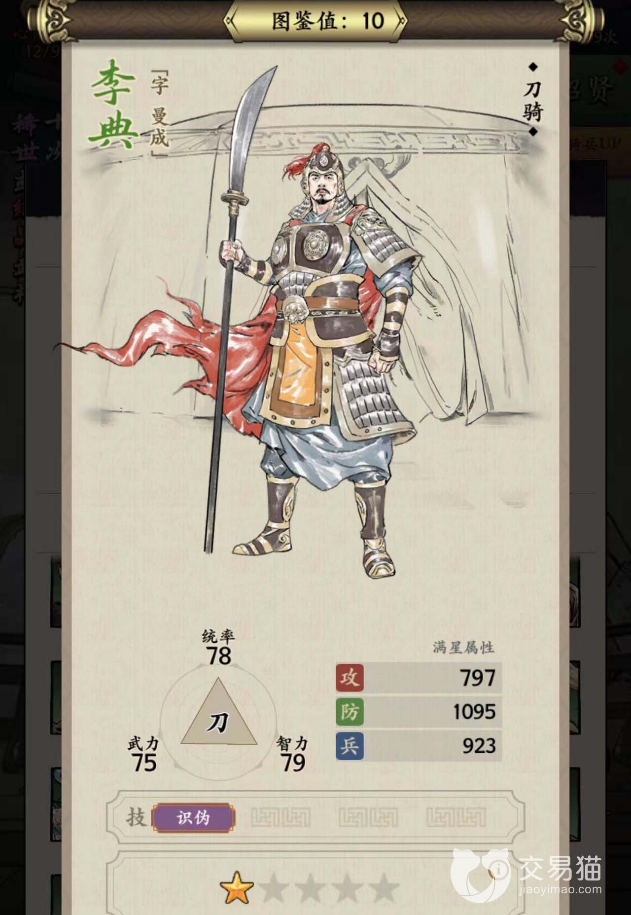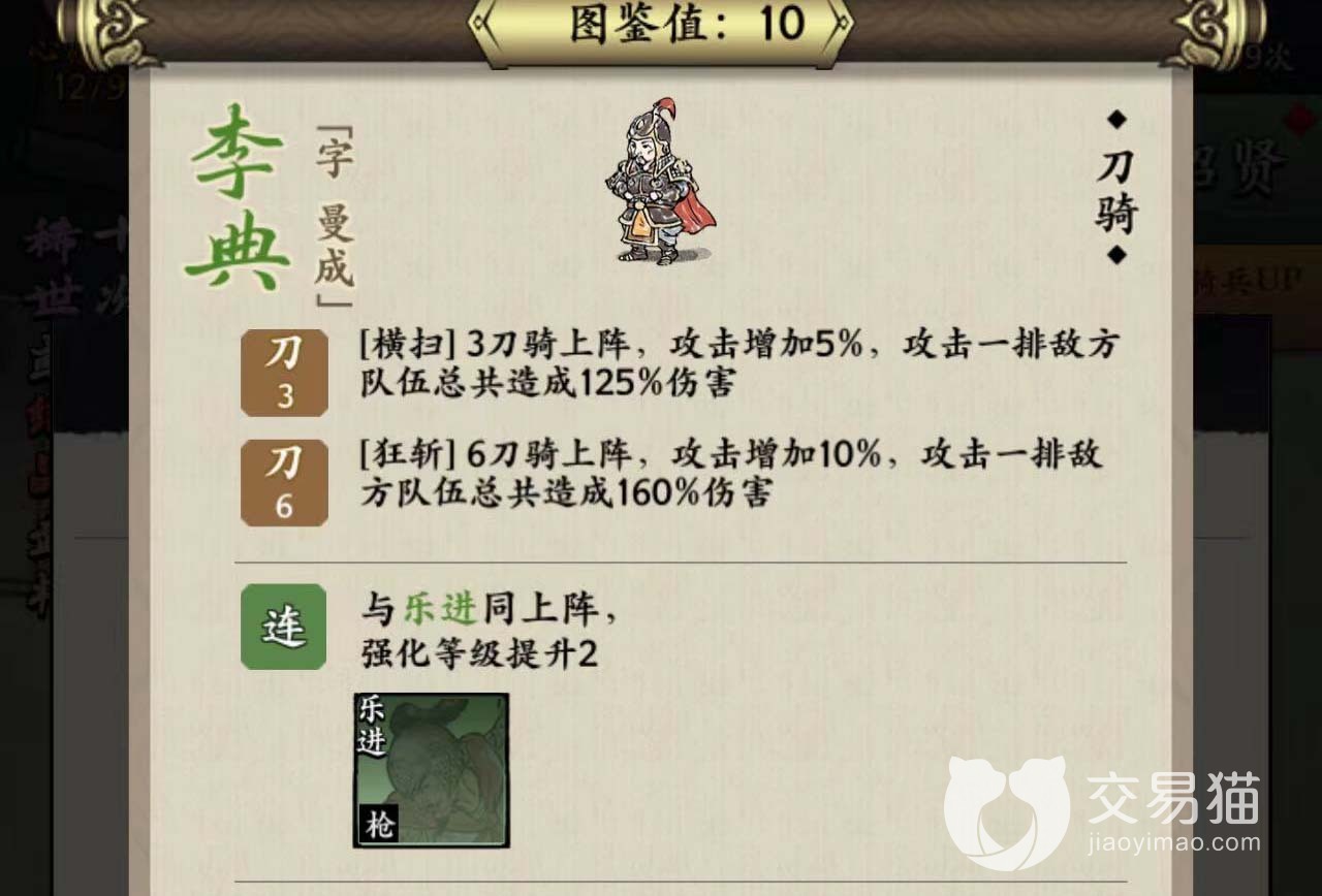 李典在游戏里面扮演的是刀骑,整体的属性看上去没有太大的缺点。攻击力大概有800点左右,然后防御值高达1100点左右,只不过兵力也同样为900多点。所以整体看上去这个角色他更加注重防守,如果阵容上缺少坦克的话就可以用它进行防御。虽然他只是一个绿卡,但是三维属性还是挺均衡的。