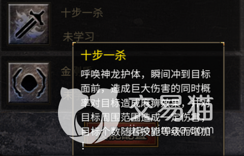 十步一杀:这个技能的效果十分强大,能够召唤出远古神龙,并带动小伙伴们闪现到敌人的面前造成高额的伤害并附加麻痹的debuff,同时还能对怪物或者敌人的周围造成一定的伤害,随着技能等级的提升,额外攻击的目标也越多,是一个不可多得的aoe技能。