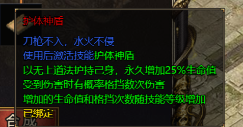 护体神盾:这个技能属于这款游戏中超级神技之一,使用过后不仅能够永久增加相当大比例的生命值,还能够有概率格挡伤害,增加的生命值还会随着技能等级提升而增加,如果小伙伴们运气爆棚获得了,一定要及时使用。