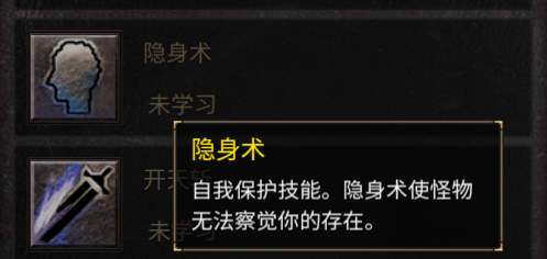 隐身术:虽然这个技能没有任何伤害,但是却是一个不可多得的优秀自我保护技能,开启之后能够让怪物或者敌对玩家失去玩家的位置,是一个非常好用的消除仇恨的技能。