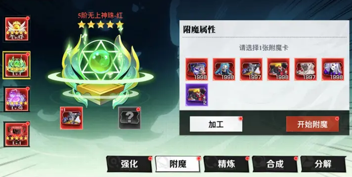 珠子的另一个重要功能就是附魔,通过游戏中挑战或者抽取获得的附魔卡镶嵌到神珠上,能够获得相当多的 战斗属性加成,比如提高防御能力或攻击力,可以根据自身需要选择相应加成的附魔卡,提高队伍的整体实力。