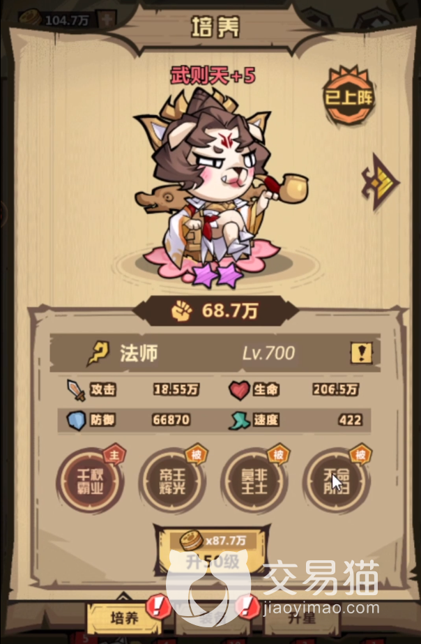 首先放上队员的配置:一号位选择狄仁杰,这名角色的普通攻击带有群控效果,是队内的控制担当;二号位大家可以放上自己手中练度最高的C位狗将,比如貂蝉、吕布等,这里小编选择的是曹操;三号位选择法师角色武则天,四号位选择关羽,最后的五号位,自然是万能的辅助角色太乙真人了。