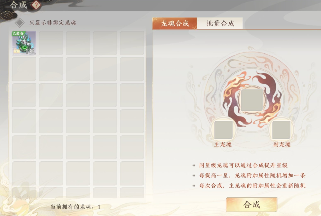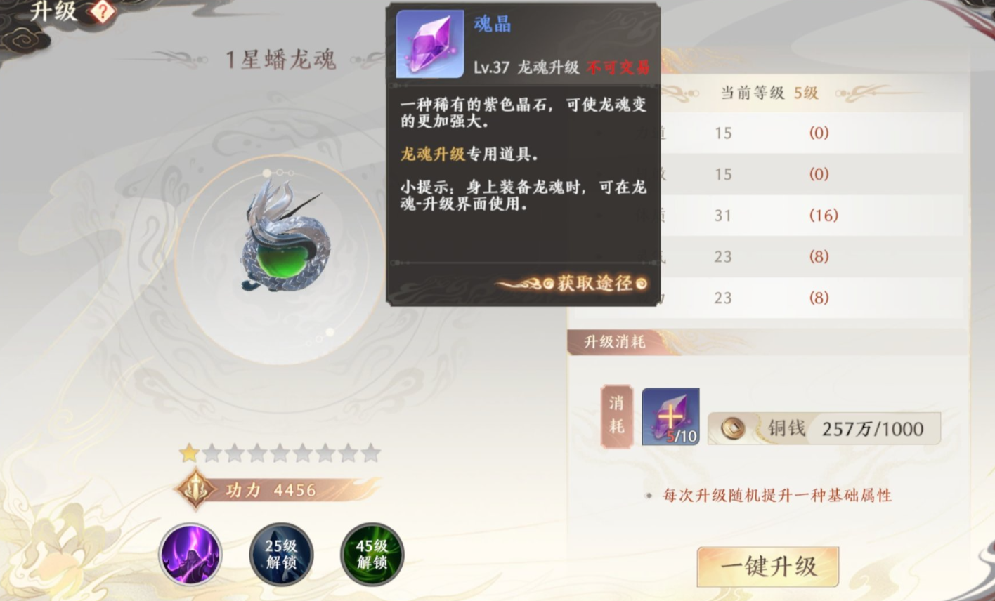 而这里大家首要明白的就是,这里龙魂的强化并不是单个的一处强化系统,这里是比较常规的就是进行升级了,各位可以消耗一定的材料来提升它的等级,每次完成等级提升之后,它的各项属性值便会对应增加。