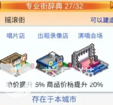 摇滚街听这个名称,肯定需要有音乐。那么玩家需要修建唱片店,加上录像店以及演唱会场。鬼塔街建成需要玩家修建住宅大楼以及广播台,广播台的周边还要再修建一栋住宅大楼,才能成功搭建鬼塔街。好莱坞街这个专业街就充满了时尚和灵感,所以玩家在搭建好莱坞街时一定要记得是电影院加上主题公园,再加上宝石店或者时装店任选其一皆可。游戏当中能够组成最后一个专业节叫做穿梭街,这个专业街对于居民的生活来说是极大的便利,主要由太空旅行局加上摩天高塔以及机场组成。玩家组合出这个专业街后,就可以解决时间问题上的烦恼。