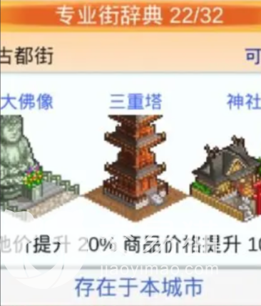 那么再往下细分,如果玩家想要在游戏当中组成快餐街,就需要让咖啡店和面包店加上便利店建造在一起。硅谷街则是需要玩家将电脑城以及手机店,还有游戏公司放在一条街上组成硅谷专业街。古都之街则需要大佛像加上三重塔以及神社才能建成。动物街听这个名字,玩家们也应该知道这条街上充满了动物,那么需要修建动物园加上宠物店以及牧场。这三个建筑组合在一条街上被称为动物专业街。