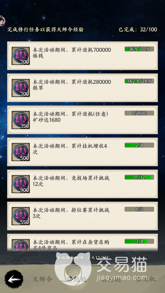 修经验中大家可以领取经验,这些经验就是天师升级所需要的经验,上面会有很多的成就,大家每达成一个要求就可以领取一定的经验用来升级。占星轮就是一个抽奖的页面,需要消耗大家在天师令页面中获取的观星策,一个观星策只能抽一次,占星可以获取各种加速道具、矿砂、株钱以及角色碎片等等道具。