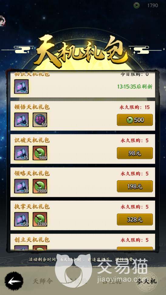 最后一个参天机,这个页面就是一个充值的页面,上面的天机礼包有很多,从98到648的都有,最便宜的是用瑰玉购买的礼包,基本上礼包里面都是观星册以及瑰玉奖励,大家要是不想充值,也可以购买最简单的顿悟天机礼包。