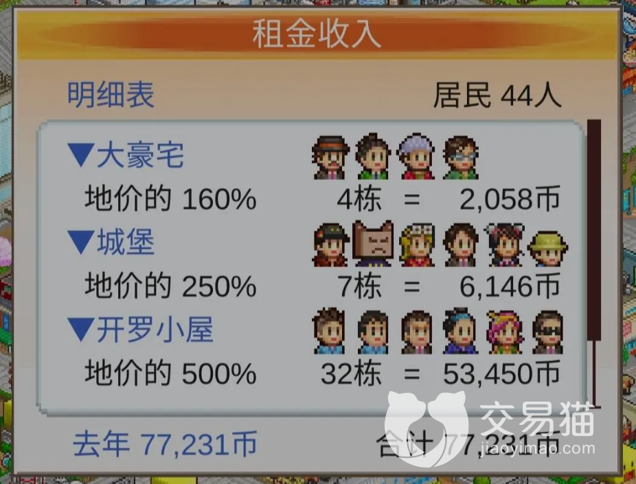 住宅级别分为6种类型,除去平房这种类型不需要任何升级条件之外,从小户开始就需要40w的金币,不过房租能够到达80%,升级到公寓需要80w金币加上任意一种高级道路,房租也会上升到100%,升级到大宅邸则需要120w金币和砖瓦路,通知需要专职职业解锁,房租能够达到160%,升级到城和开罗屋均需要200w金币和磐石路,并且需要宇宙人职业的居民和开罗软件师居民才能解锁,房租分别达到了250%和500%,升级到开罗屋的时候已经是这款游戏的天花板级别了。