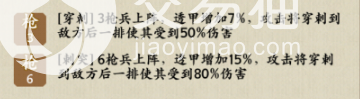 在技能之后就是他的羁绊了,羁绊上分为两种,一种是兵种羁绊一种是武将羁绊,首先是兵种羁绊,这个兵种羁绊分别是枪3和枪6,枪3需要他和另外两名枪兵组成,组成之后他会获得百分之7的穿甲属性,枪6则需要他和五名枪兵组成,组成之后他可以获得百分之15的穿甲属性。