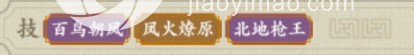 之后是技能方面,他一共有三个技能,这三个技能分别是百鸟朝凤、凤火燎原和北地枪王,这三个技能都是攻击类型的技能伤害都很高,其中火凤燎原还有烧伤效果被攻击的敌人会受到一个灼烧duff。