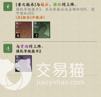 第二种武将羁绊,武将羁绊上他也有两个,第一个是和张云、张任组成的童之枪术,这个羁绊可以提高他的攻击力和穿甲能力,第二个羁绊是和贾诩组成,组成羁绊之后他的等级会上升两级,总的来说张绣这位武将还是不错的,在枪兵武将中是比较强的存在。