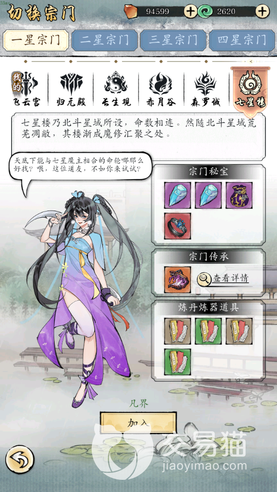 七星楼:首先它在秘宝上就要比前面三个宗门多一些,而且作为一星宗门它的传承是攻击和速度,可谓大大提升了前期的清图效率,再加上它秘宝中的指环还增加了额外的物抗,对付前期大多都是物理伤害的敌人算是绰绰有余了。