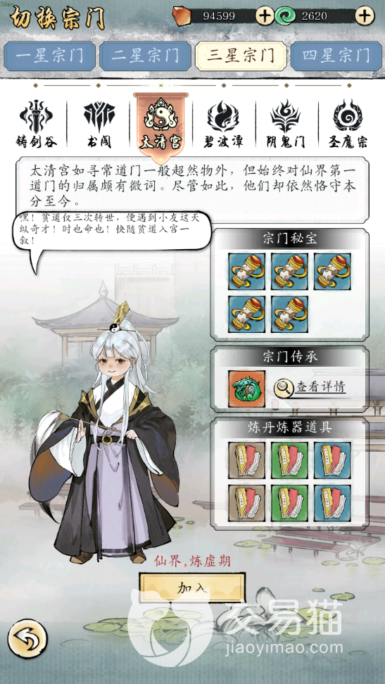 太清宫:到中后期时敌人的伤害会变高,此时三星宗门选太清宫能够让你的坦度提升,因为它的传承可以提供巨额的护盾以及封穴手段,这些都可以让敌人的输出被抵消,加上它本身的秘宝是黄泉秘法,在提升修为上也起到了巨大帮助。
