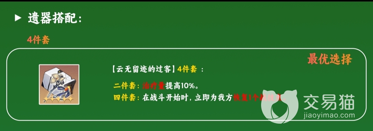 首先布洛妮娅是一个五星风属性辅助角色所以对于布洛妮娅来说最为合适的遗器就可以加大治疗量的遗器:云无留迹的过客。这个仪器可以给布洛妮娅提高治疗量,二件套可以提高10%的治疗,四件套可以为我方所有角色增加一个战绩点,让我方队友可以更快的使用技能,这对于大局来说是非常重要的。