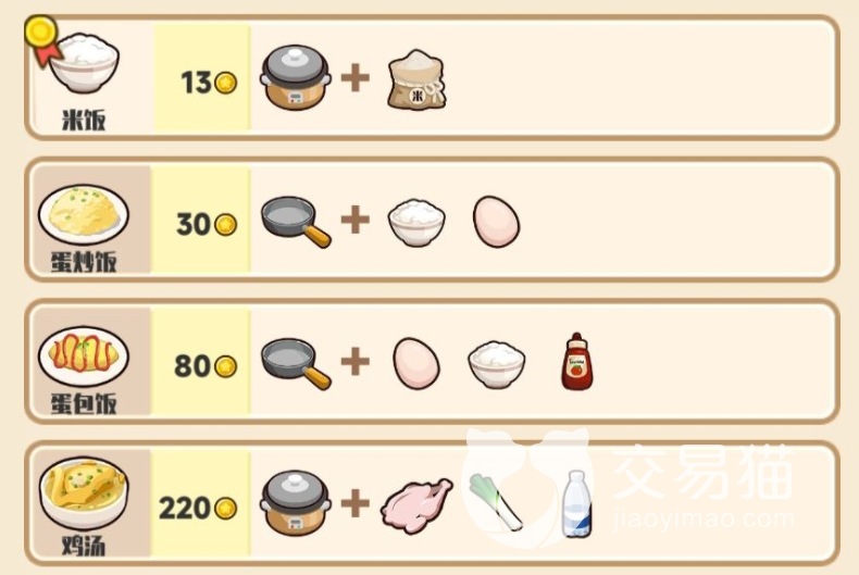 餐厅当中的菜谱也是同样的重要,玩家得依靠制作美味的菜肴给客人,才能让餐厅赚到钱。游戏里也录入了非常多的菜谱供玩家了解制作,咱们先来看看主食。米饭定价13金币,需要电饭煲加上大米就行。蛋炒饭定价30则是炒锅加上米饭和一个鸡蛋,加一个蛋米饭价格瞬间翻倍。蛋包饭定价80需要炒锅加蛋加米饭和番茄酱。鸡汤的定价不菲,需要220金币,玩家要准备电饭煲加上一只整鸡配上大葱和矿泉水。