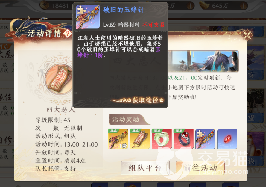 如果你的运气够好,那么也是有机会在击杀它们之后直接获得一个完整玉峰针的,这个暗器对于玩家的提升很大,直接获得一个完整的也会省去不少功夫。当然,该活动的开启时间和刷新的恶人数量是有限的,所以建议大家尽量在活动刚开始的时候就前往参加。