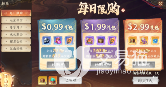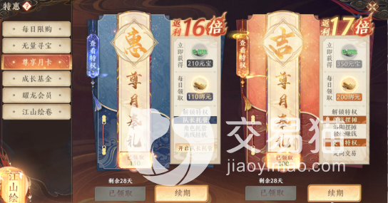 这款游戏的月卡分为两档,首先是普通月卡,一个月只需要16元,在购买以后我们会马上得到300元宝,并且每天都登录的话可以领取90元宝以及一个紫色宝箱,宝箱里面都是高级的宝石等资源哦!最终获得的元宝数量是我们直接充值的20倍,性价比极高无比!